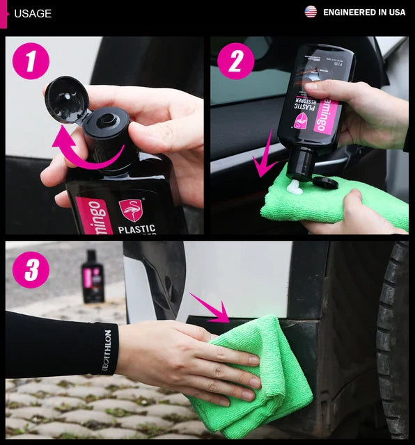 ¡Nada complicado! Solo limpia el plástico, pon un poco de Flamingo en un paño y pásalo por la superficie. En minutos ves el cambio.